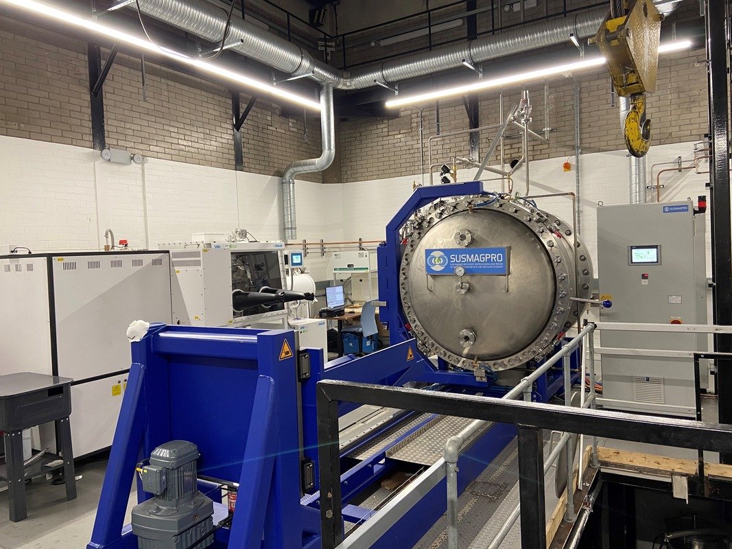 A range of advanced and highly unique equipment to enable the sensing, sorting, separation, purification and re-processing of rare earth permanent magnets. The equipment will include pre-processing equipment (cropping machines), a hydrogen reactor >2000 litres, powder processing unit including sieves, jet mill and blending system, magnetic aligning presses (uniaxial and transverse), pellet press and sintering furnace. The equipment can also be used to process primary rare earth cast alloys.